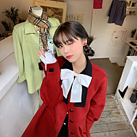 一个女生,红布背景,黑色大波浪长发,大红唇,黑色皮衣,金色大耳环,低饱和度,加强阴影。