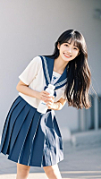 蓝天白云,日本,jk少女,齐刘海,弯腰朝向镜头,手拿包包