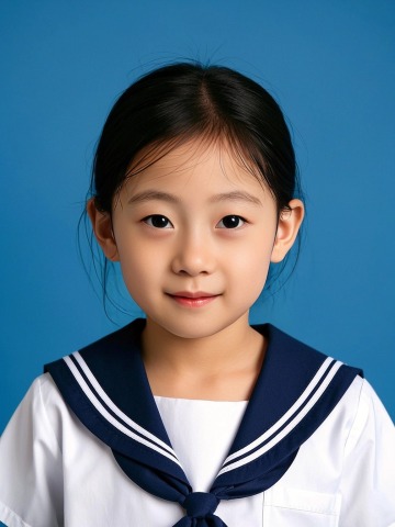 小朋友,女生,水手服穿搭,蓝色背景,干净的背景,证件照