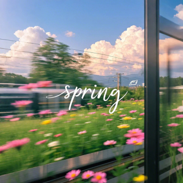 高铁窗外,绿色花朵,粉色的云,手写的字体“spring”