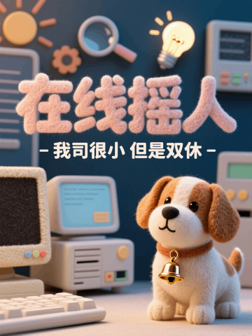 主标题为3D毛毡风“在线摇人”,副标题为“我司很小 但是双休”,右下角有一只小狗挂着铃铛,背景由电脑、灯泡、放大镜元素组成