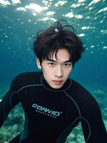 一个帅气男生在深海之中身穿潜水服,直视镜头,粒子颗粒装饰,以深蓝色调为主