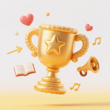 金色的奖杯为主体,上面有一颗金色星星,悬浮状;周围小元素点缀:桃心,书,桃心,箭头,喇叭,音符,黄白渐变背景