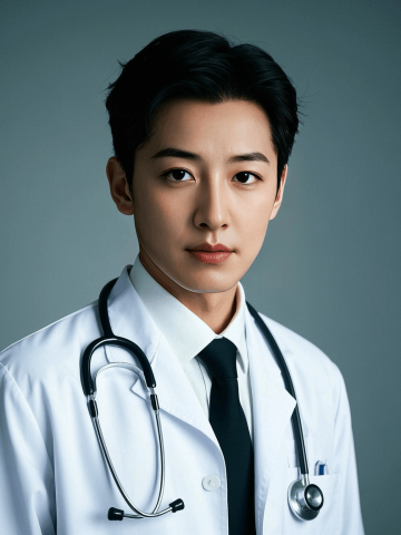 变成一个男生,医生职业证件照,白大褂,听诊器,纯色背景,正面,素颜,半身照