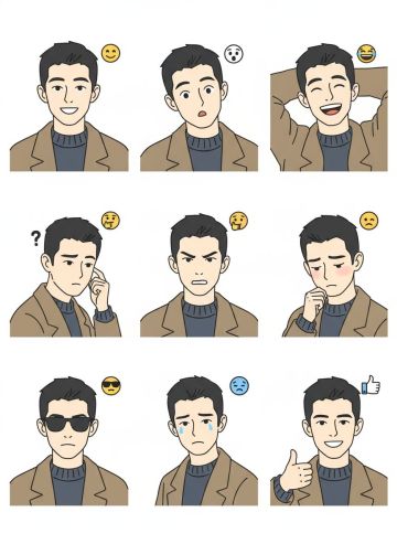 保持人物主体不变,创作一组简笔画风格表情包,搭配一些emoji图标,包含表情不同、姿势不同的九宫格表情包