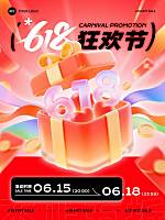 巨大3D数字“618”,背景为购物车、红包、放射线、金币元素组成的场景