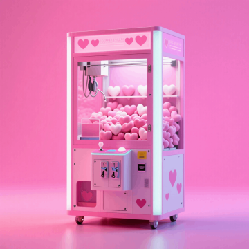 一台完整的娃娃机全身,里面堆满爱心,粉色背景,四周留白