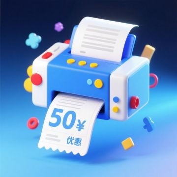 打印机正打印出50元黄色优惠券;打印机旁有蓝白配色部件、带黄与红的装饰,打印机呈现完整,整体色彩明亮清新