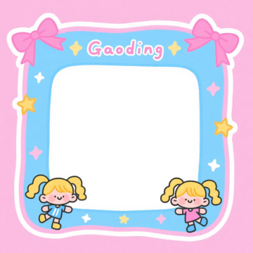 中间为大面积正方形文本书写预留区域(白色),顶部“Gaoding”,边缘装饰:星星、蝴蝶结、金发双马尾小孩。整体采用蓝粉色调。粉色边框
