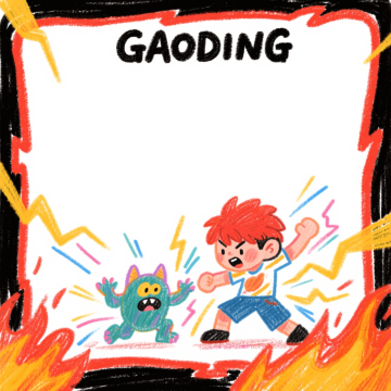 中间为大面积正方形文本书写预留区域(白色),顶部美式复古游戏字体“GAODING”,边缘装饰:底部一个红发男生正在和小怪兽战斗,四周闪电和火焰,黑色边缘。红黑色系