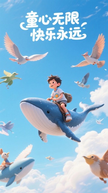 打造一幅六一儿童节主题画面。画面中心是一个迪士尼风格小孩,穿着红色的短袖和黄色的鞋子,开心地驾驶着一架红色的小型飞机,飞机的金属部分呈现出光泽感,显得精致而酷炫。小孩的头发是棕色,随风飘动,脸上洋溢着灿烂的笑容,传递出欢乐与自由的感觉。画面上方的“6.1儿童节” 文字采用富有艺术感的手写字体,颜色为白色,旁边点缀着星星和蝴蝶元素,蝴蝶呈现出淡紫色,带有透明的质感,仿佛在空中轻盈飞舞,增添梦幻氛围。文字下方用英文标注“Children's Day” ,再搭配中文“童心未泯 未来可期” ,传达出积极向上的情感。背景是一片广阔的蓝天,飘浮着洁白蓬松的云朵,远处可以看到绿色的大地和一些房屋,展现出开阔的视野。