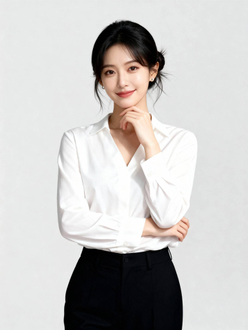 保留人物脸型、发型、年龄特征生成职场形象照,50mm标准焦段,F/4光圈(F/2.8-F/4区间),相机与人物距离3米,横向16:9比例(左右预留环境空间),人物占画面70%,入镜头部至膝盖上方5cm,主体锐利,美颜磨皮韩式精致自然的浓妆,白色V领韩式版型长袖衬衫,黑色西裤,职场通勤风格; 黑发束起低盘发(带碎发)发型精致有型,佩戴简约小耳环; 单手轻托下巴,另一手自然交叉于臂弯, 站立姿势,浅笑,人物居中,头肩比例协调,平视视角,人物居中构图,头肩比例协调,姿态优雅,均匀肤色提亮肤色,从容自信,专业人像摄影,柔和自然打光,画质清晰,头部完整,高清棚拍专业摄影人像写真,去除人物之外的所有元素,超高清肤质,细腻毛孔纹理,8K,超高分辨率,简约浅灰色纯色背景。