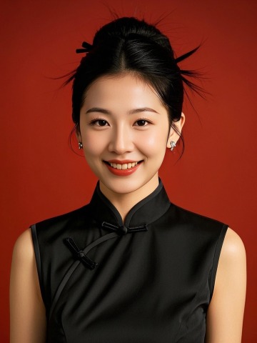 一个女生,工作形象照,黑色旗袍,红色背景,新中式