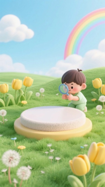 绿色草坪上有一个空着的圆形展台上,旁边有一个小朋友穿着一套浅绿色衣服,蹲在展台后面拿着放大镜观察展台方向,周围黄色郁金香和蒲公英种子,背景是蓝天白云,七彩彩虹。整体配色方案清新柔和