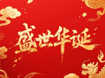 文案“盛世华诞”文字,烫金水墨,金色国风元素,文字横向排列,纯红色背景