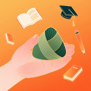 一个肉嘟嘟的手托起一颗粽子,周围漂浮着教育相关的元素(元素尽量保持完整),亮橙色背景