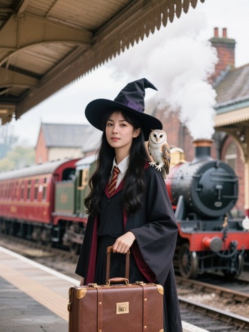 人物穿上魔法师衣服与大帽檐的魔法帽,手提行李箱站在有屋檐的火车站台上,背景是蒸汽火车头喷着白烟,红色列车车厢,肩膀上站立一只小猫头鹰,英伦复古滤镜