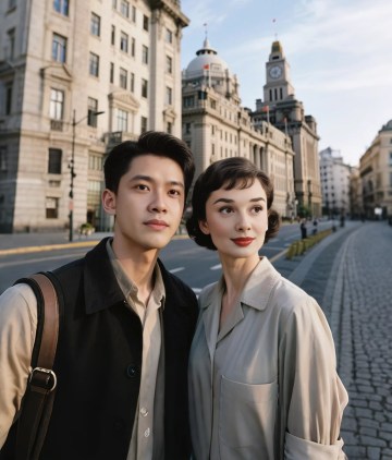帮左边的男生生成一张和右边奥黛丽赫本在上海外滩的合照,图片要求真实感强,细节丰富,一张非常真实的素人与明星的合照