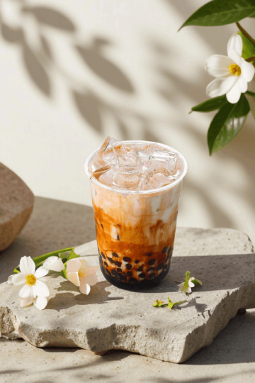 产品被放在不规则的岩石面上放置于桌子,茉莉花,自然渐变,柔和自然光与墙上阴影形成呼应,高级感