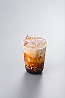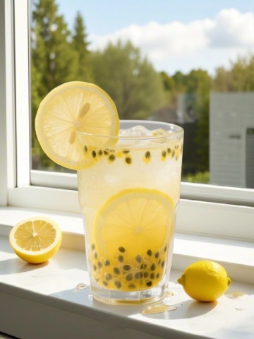 产品放在北欧风格白色窗台上,冰块、水渍、柠檬切片,窗外背景是树木、蓝天白云