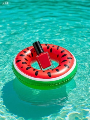 画面中心是主体放在一个造型为西瓜切片、红绿色相间且带有黑色西瓜籽图案的充气游泳圈,以澄澈的蓝绿色水面为背景,水面有波光粼粼的质感。
