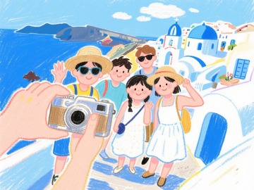 圣托里尼蓝色之城,朋友们的旅行合影,相机,墨镜,草帽,白裙,俯视视角,阳光明媚,蓝天白云背景