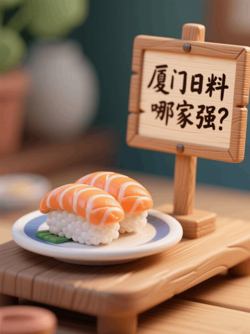 3D粘土风,主视觉是一个三文鱼寿司被放在盘子里,木牌文本框里手写字体为”厦门日料哪家强?”