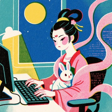 嫦娥在工位上抱着小兔子,眉头拧成结,另一只手敲击键盘,夜晚窗外有黄色的月亮