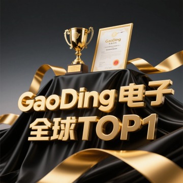 立体金色 “GaoDing电子全球TOP1” 字样,搭配黑色绸缎与金色丝带,奖杯和证书在字上面,背景为深邃渐变色调,光线聚焦主体,营造高端荣耀且具科技感的氛围,突显顶尖成就。