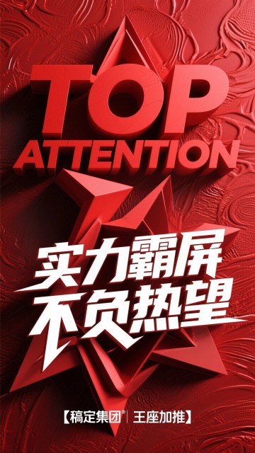 主色调为红色,背景压纹;融入变形艺术字体”TOP ATTENTION“;主标题“实力霸屏 不负热望”大字,副标题“稿定集团”“王座加推 ”;整体风格大气
