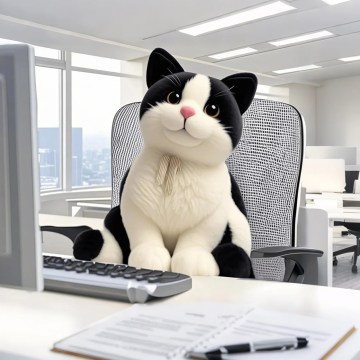 拟人胖乎乎圆滚滚橘猫穿着西装手拿着咖啡,在办公室繁忙的加班,背景夜晚
