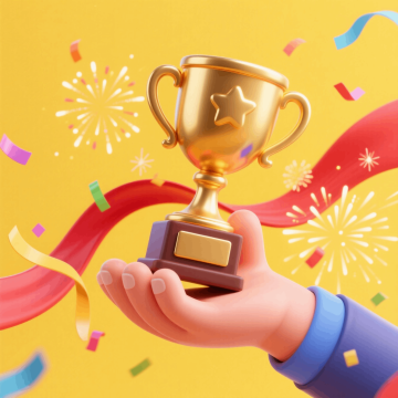 一只手捧着金色奖杯,奖杯周围有红绸、彩带、小烟花点缀,黄色背景