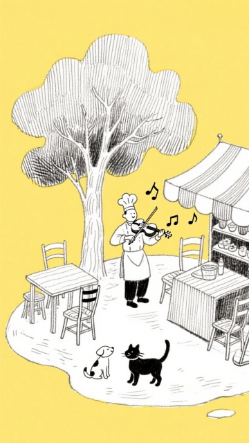 (一个小岛:树,集市,桌子,椅子,置物架,厨师演奏小提琴,音符飘扬,小狗,小猫);主体黑色描边填充白色,黄色背景