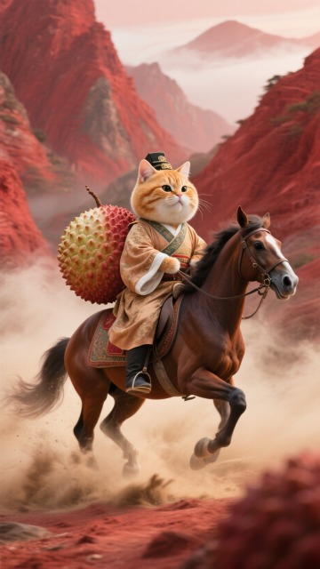 拟人胖乎乎圆滚滚橘猫穿着唐朝长安荔枝使的官服,骑在马上,背上背着一颗巨大的荔枝。烟尘滚滚的在红色山峦间。全局朦胧模糊效果,多重曝光,拖影,超广角强透视构图