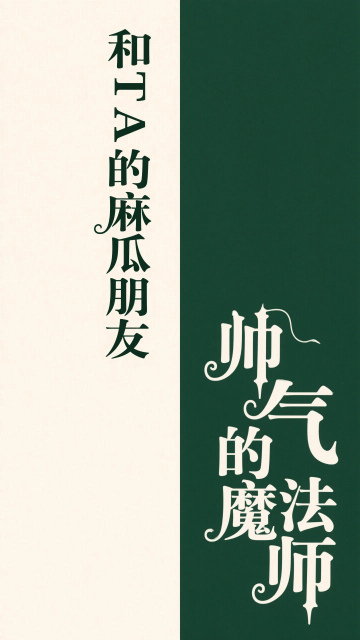 垂直分割画面为左右两部分,左侧米白色,右侧深绿色。左侧竖排(和TA的麻瓜朋友)位于上方,右侧竖排(帅气的魔法师)位于下方,字体有设计感