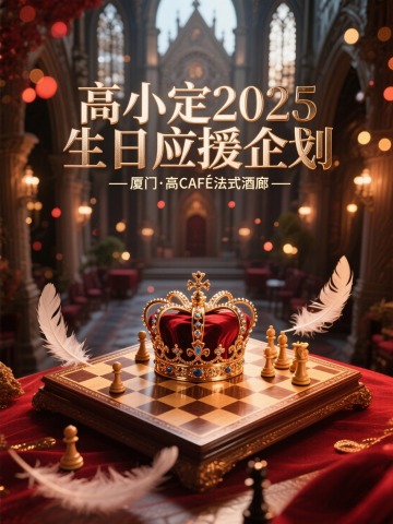 主标题(高小定2025生日应援企划),副标题(-厦门·高CAFE法式酒廊-),背景华丽的皇冠在棋盘上,俯视角,在光线昏暗的欧洲大教堂,有羽毛元素,红金主色调,欧洲宫廷复古风格,氛围朦胧、梦幻、华丽,画面铺满光斑