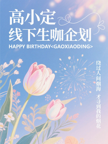 梦幻文艺氛围,手绘风,主标题极细字体(高小定 线下生咖企划),副标题英文(HAPPY BIRTHDAY<GAOXIAODING>),右侧竖排小字(绕过人间烟海 才寻到我的烟花),有郁金香等植物元素