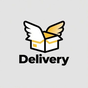logo设计,一个带着翅膀的快递盒子,下面一行字“Delivery”,扁平风格,整体明亮动感,电商logo,纯色背景