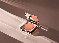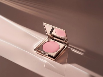 以渐变浅粉色为背景,用造型古朴的枯木作为主体架构,嵌入带盖腮红盘,搭配带白色花朵、绿叶的弯曲花枝