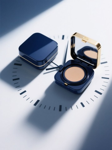 俯视,两个深蓝色外壳方形气垫,右边打开的气垫(带有金色装饰,气垫盒内露出浅米色的气垫粉芯),左边闭合的气垫,放在时钟刻度背景中间,一道光线从右侧倾斜照射而来,深蓝色阴影