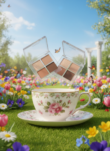 一个巨大的精致陶瓷茶杯,杯身绘有粉色花朵与绿叶图案,放在青翠草坪上,茶杯上漂浮着两支图中的主体。背景是阳光明媚的欧式花园,开满五彩缤纷的鲜花,如雏菊、紫罗兰、郁金香等,周围飞舞着彩色蝴蝶。天空湛蓝,白云飘逸,远处有白色石柱拱门,营造出童话般的春日午后氛围,适合高端美妆品牌广告海报。