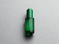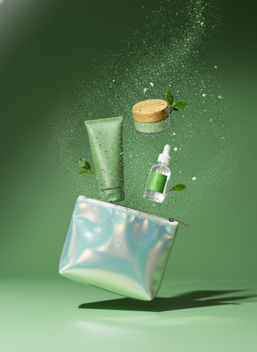 图中主体从一个绿色镭射化妆包里飞出,周围漂浮同色系粉末,背景为绿色渐变,光线高级,凸显商品质感,适合高端美妆品牌广告