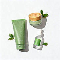 产品为主体,摆放白色石块做层次,把产品放在石块上,周围摆放白花,点缀绿色植物。