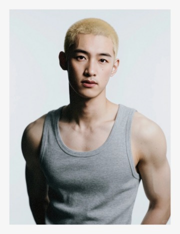 一个男生,金色寸头,灰色工字背心,低饱和度,加强阴影,肌肉线条明显,白色背景。