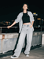 暗调的老式公园娱乐区,女生(玫红色印花修身短袖搭配低腰做旧牛仔短裤,彩虹色条纹袜套、皮靴,千禧年配饰)坐在摇摇玩具上。看镜头。