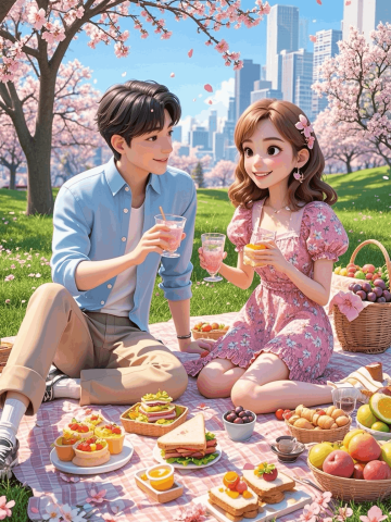 春日,一个男生和一个女生坐在草地上野餐,有很多美食,露营,背景是樱花树和城市景观