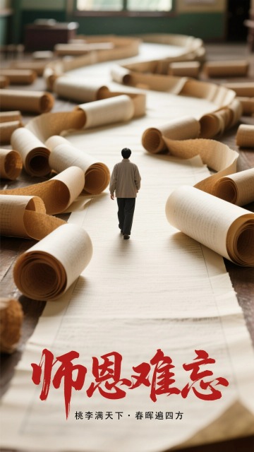 试卷卷曲成蜿蜒纸路,教师独行纸路中心(背影 ),复古棕黄 + 米白报纸色调;最下方红色雄浑书法大字“师恩难忘”,黑色小字“桃李满天下・春晖遍四方”