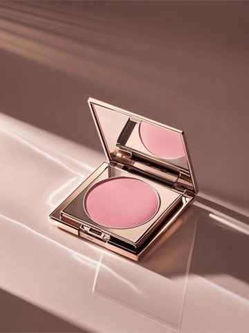 主体放置在中心,主题背后有四组粉状腮红垂直排列(浅粉到蜜桃粉渐变 ),每组倾斜,模拟手指涂抹腮红痕迹,纯净白色背景,均匀光影凸显粉体颗粒堆积、刷痕色彩过渡,借微距视角传递“粉质细腻、显色柔和”