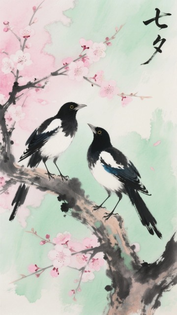 画面以粉绿为底色,营造出浪漫氛围,两只喜鹊停在桃花树上,书法小字“七夕”位于画面右上角。