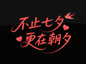 文字“不止七夕 更在朝夕”,文字穿插点缀爱心和喜鹊。高级感,黑底红字。